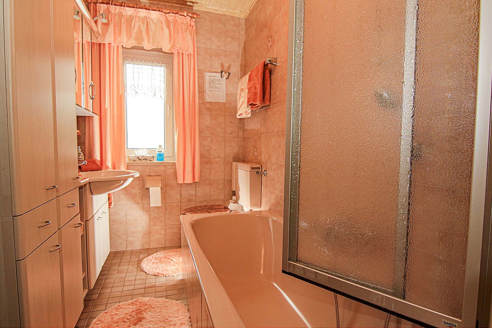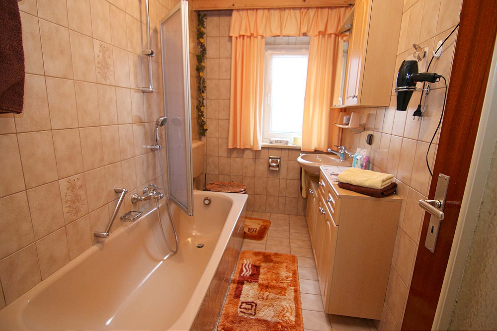 - einem Bad mit Badewanne, verstellbarer Duschwand, WC und Waschbecken