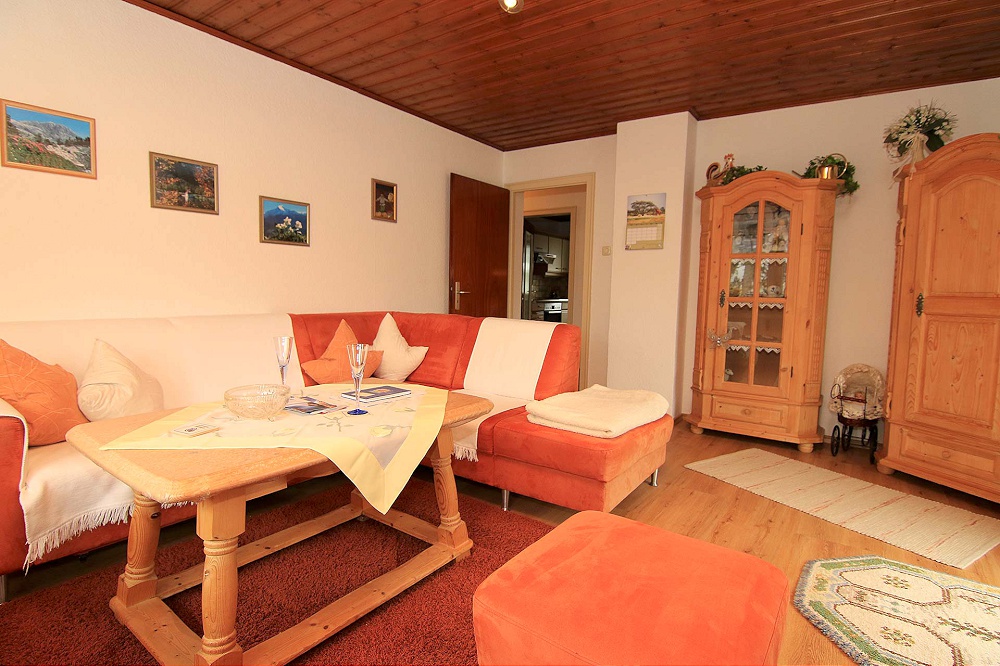 - einem Wohnzimmer mit Flach-TV, (ausziehbarer) Eckcouch, Bauernschränken